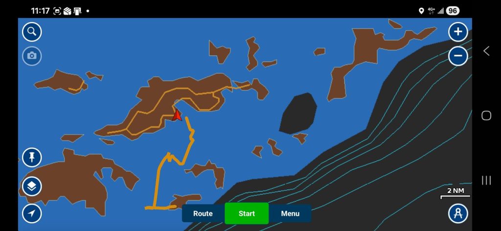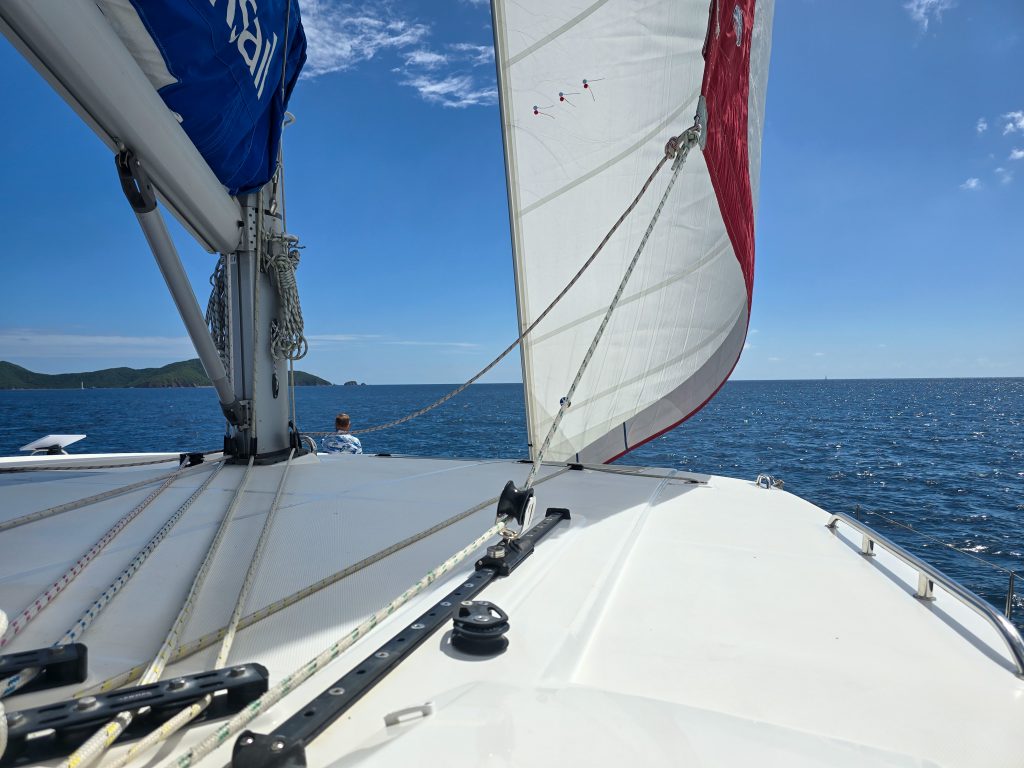 We started the day with our boat briefing, and then it was out to sea! This trip was planned to be part vacation, but also a lot of sailing instruction to earn a couple of certifications. So today started with a few hours of sailing to get used to the boat and the rigging, followed by some “close quarter maneuvering.” That meant tossing a floating buoy overboard, and practicing nosing the boat up to it, coming alongside of it, and picking it up. This is a 30,000-pound boat, but it is surprisingly maneuverable! The skills are needed when picking up a mooring ball, picking up someone who has fallen overboard, and docking.