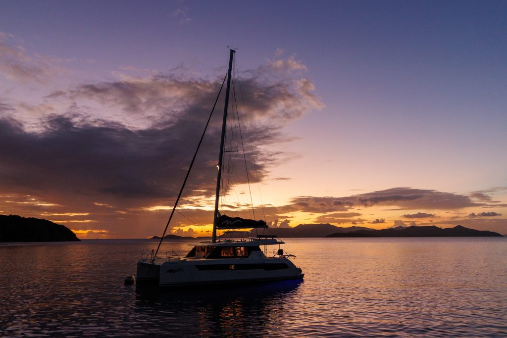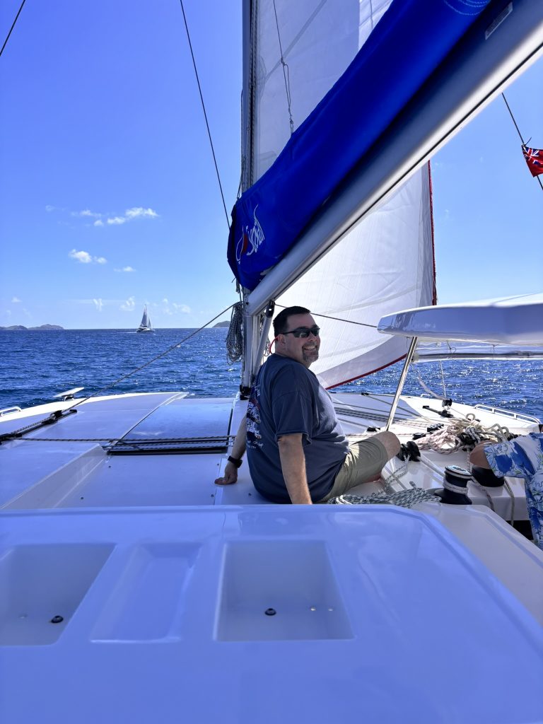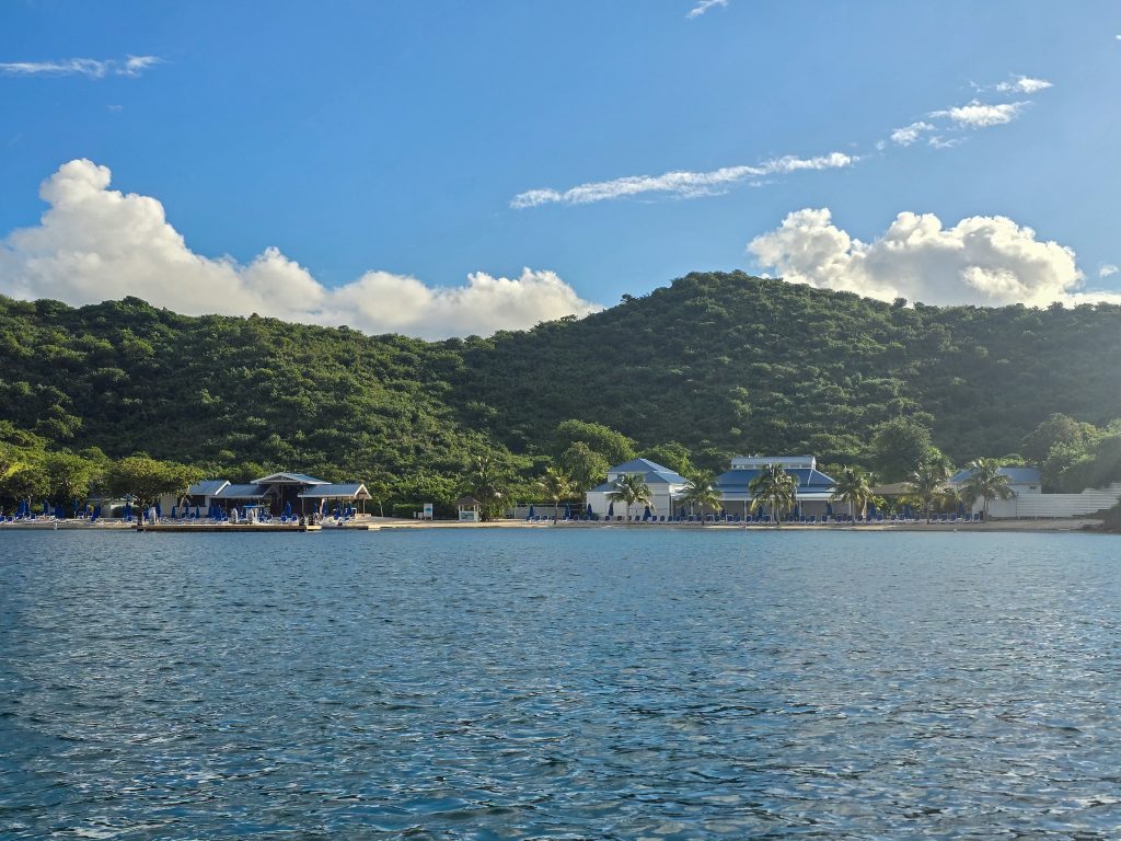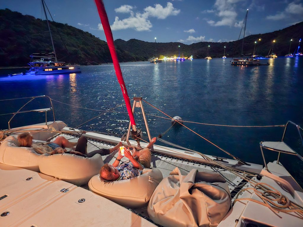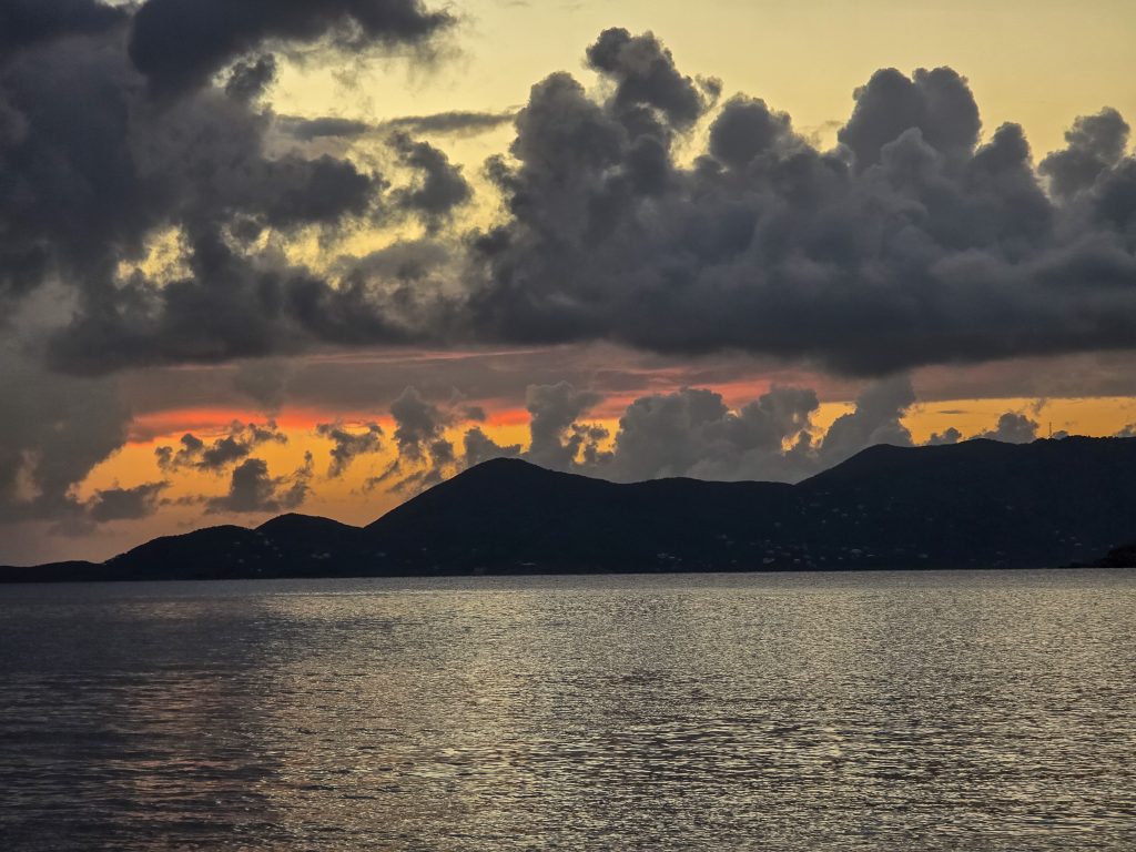 After the “school work”, it was play time, and we found a place to spend the night on and anchor ball in Bight Bay at Norman Island. Bight Bay has a bar and restaurant on the beach that you can dinghy to, as well as the world-famous “Willy-T’s” floating bar and restaurant anchored in the bay. (https://willytbvi.com). Willy-T’s is most known for its conch fritters and topless college girls jumping off the top deck into the water. We opted not to partake in either and decided on dinner at our boat and a quiet night enjoying the sunset instead.