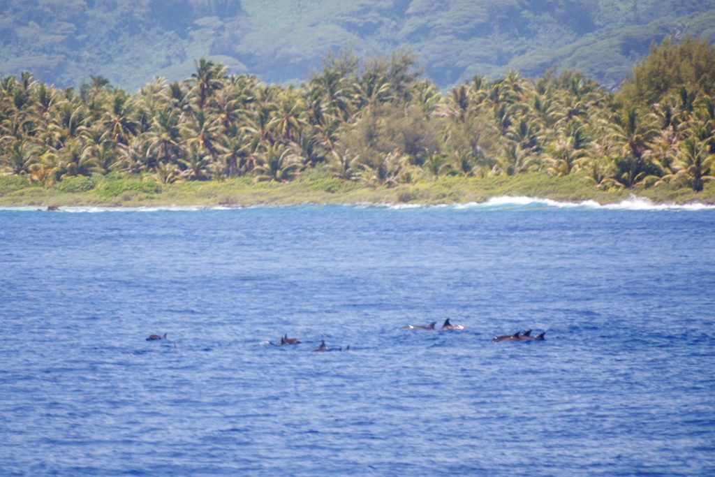 We landed in Raiatea, which must be one of the smallest airports I’ve ever flown into, and then took a short cab ride to the marina to board the boat, unpack, and do some quick grocery shopping for the week. Then we were off for a couple of hours of sailing before anchoring off the island of Taha’a. Along the way, we spotted a pod of dolphins passing by.