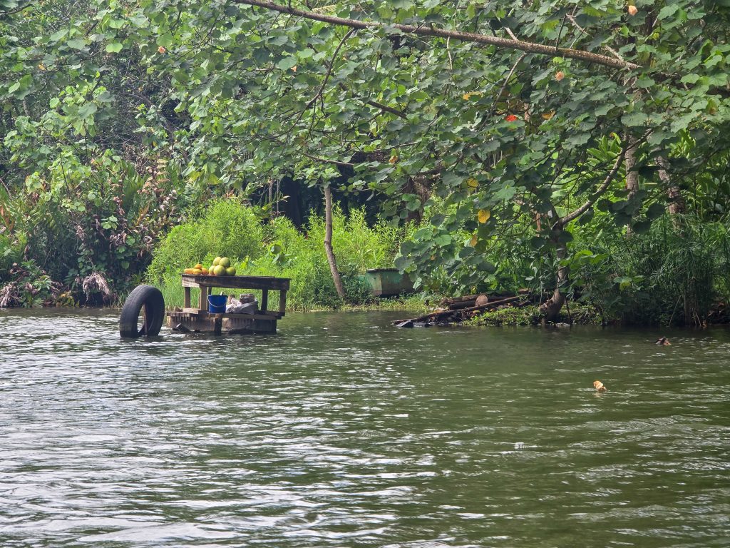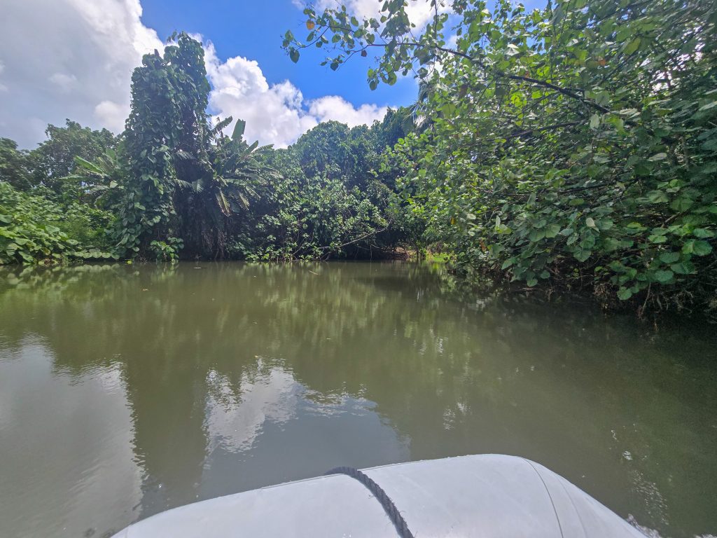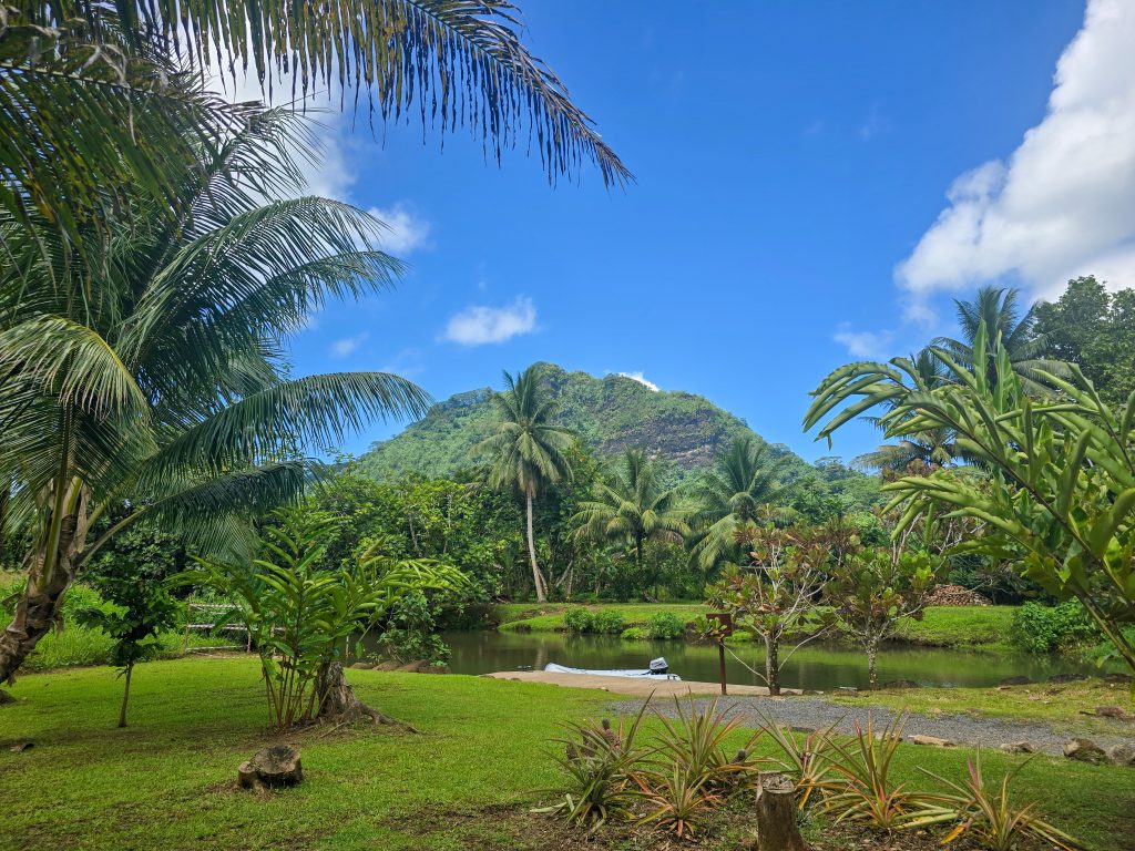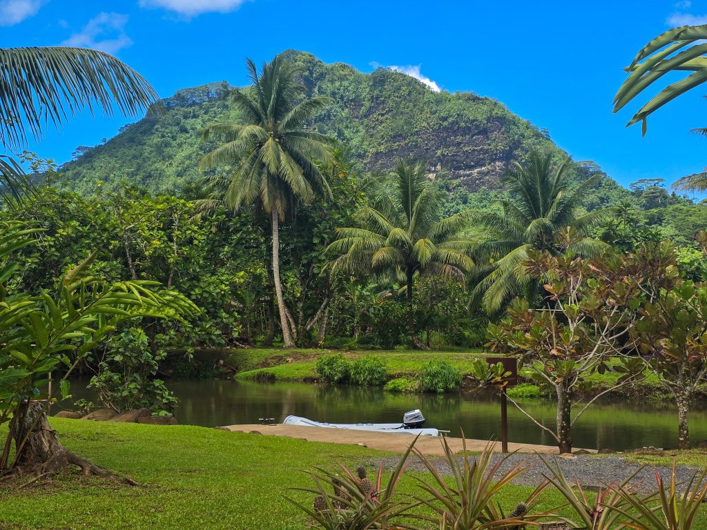While we still had a couple more days in Tahiti, today was the last day of sailing and on the water. It was a great adventure, with a sail to the east side of Raiatea to an inlet with a freshwater river leading into the jungle. We took the dinghy from the boat and worked our way up through this river, which was an incredible experience through the jungle. There were people living in the jungle along the way, and at one point, we even saw the equivalent of a roadside fruit stand, except it was in the river for people passing by boat. Just as we reached a point in the river that was too shallow to go further, there was a botanical garden. I have not idea who created or maintained it out in this remote place, but it was a beautiful place to wander through.