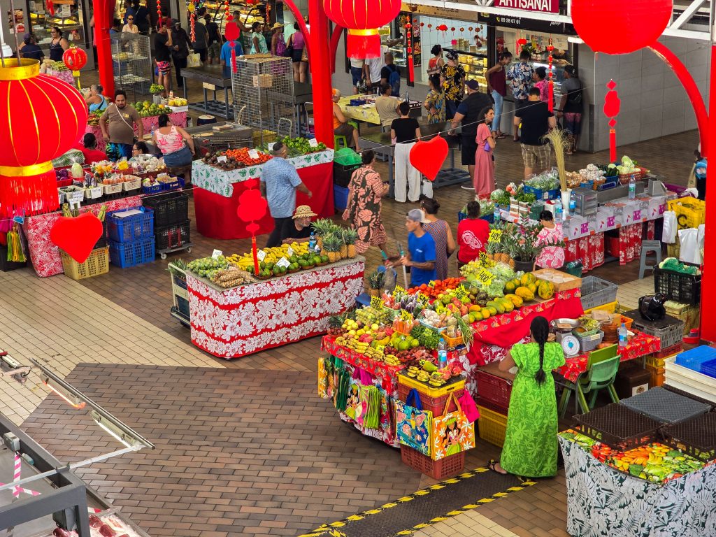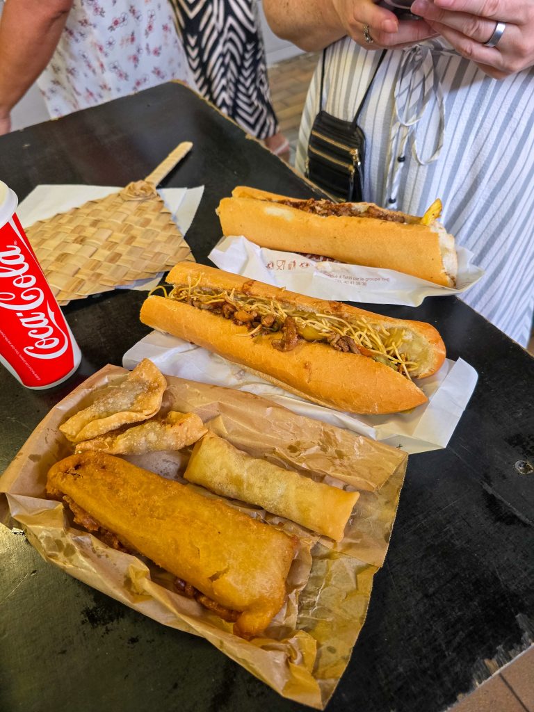 Back on Tahiti the next day, we visited the main market again for lunch (and had a local favorite, chow mein baguettes), picked up a t-shirt at the local fire department, and had dinner at some food cart stands before heading to the airport.